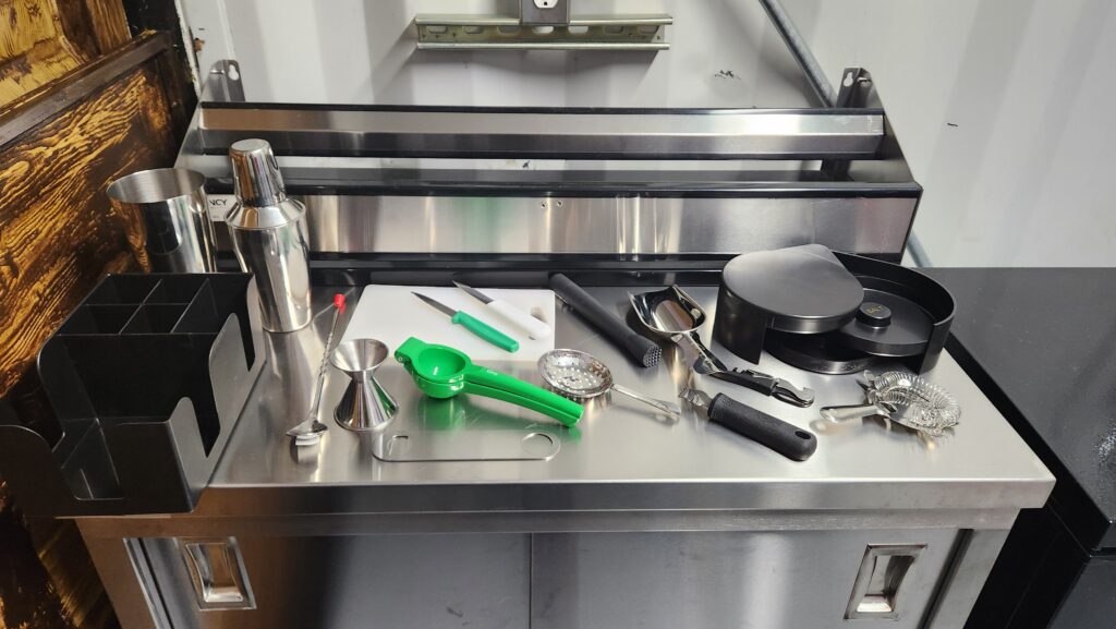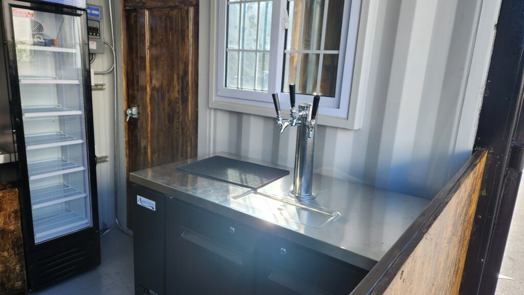 Our Portable bars come with all the essentials including a keg cooler, chest freezer, bottle cooler, 3 compartment sink, hand was sink, fresh water and grey water tanks, water heater, blender and a host of other items.